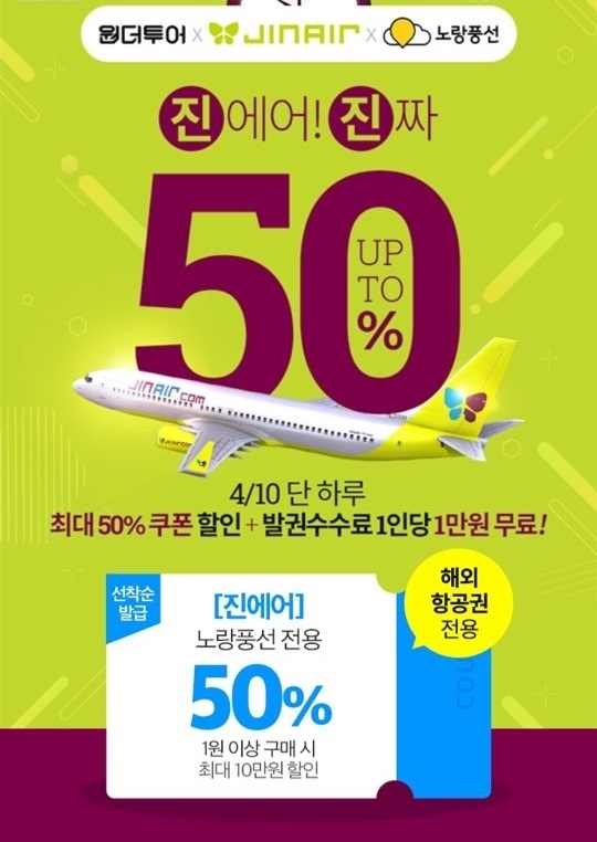 한편 원더투어 진에어 할인 대상은 노랑풍선 진에어 항공권 전 노선이다.