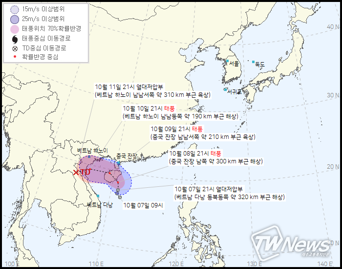 기상청은 2021년 17호 태풍 라이언록으로 발달예정인 제37호 열대저압부가 7일 22시30분 현재 베트남 다낭 동북동쪽 약 320km부근해상에서 10km/h속도로 북상하고 있다고 날씨예보했다.