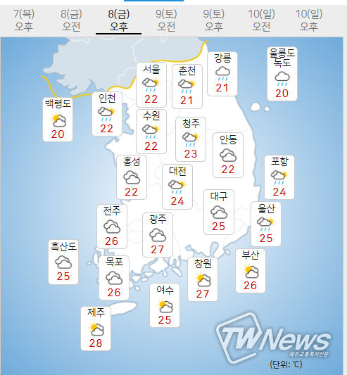 (8일) 아침최저기온은 21도 내외(평년 16~18도), 낮최고기온은 27~28도(평년 23~25도)가 되겠다.