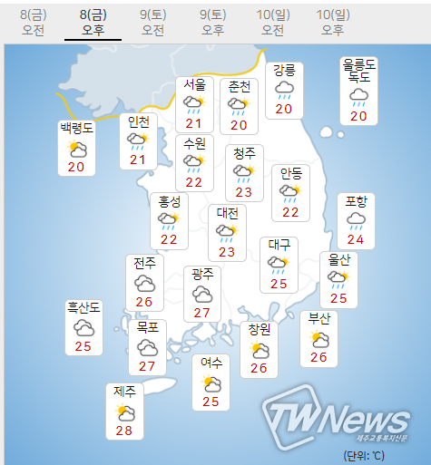 오늘(8일) 낮최고기온은 27~28도(평년 23~25도)가 되겠다.