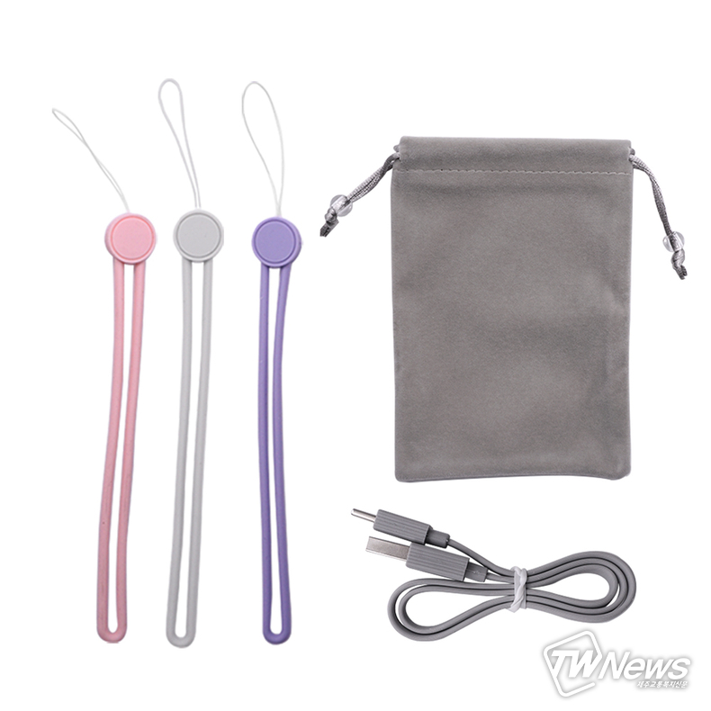 색상은 총 세 가지로 퍼플, 핑크, 그레이가 있으며, 기본 구성품에 핸드스트랩이 포함되어 있어 외출 시 편리하고 간편하게 휴대할 수 있다.