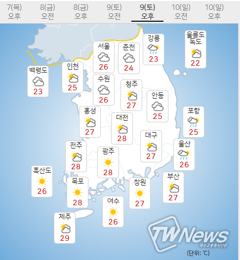 모레(10일) 아침최저기온은 16~22도, 낮최고기온은 23~29도가 되겠다.