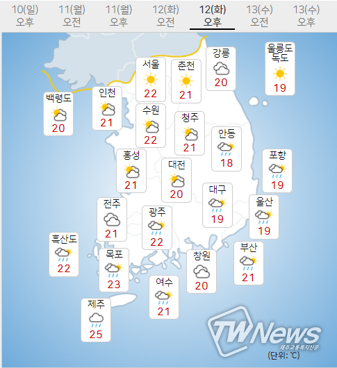 11일(월)~13일(수) 아침최저기온은 12~19도로 조금 낮겠고 낮최고기온은 20~24도로 오늘보다 낮겠다.