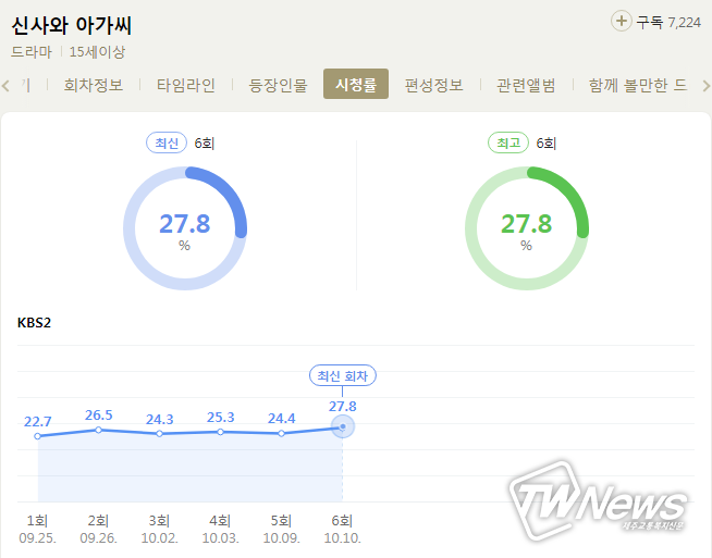 [제주교통복지신문 김현 기자] 임영웅이 목소리를 보탠 KBS 2TV 드라마 ‘신사와 아가씨’가 지난 10일 6회 방송분에서 시청률 27.8%를 달성하며 자체 최고 기록을 세웠다. 전회 시청률은 각각 1회 22.7%(9월 25일), 2회 26.55%(9월 26일), 3회 24.3%(10월 2일), 4회 25.3%(10월 3일), 5회 24.4%(10월 9일)로, 가파른 상승세를 보이는 중이다.