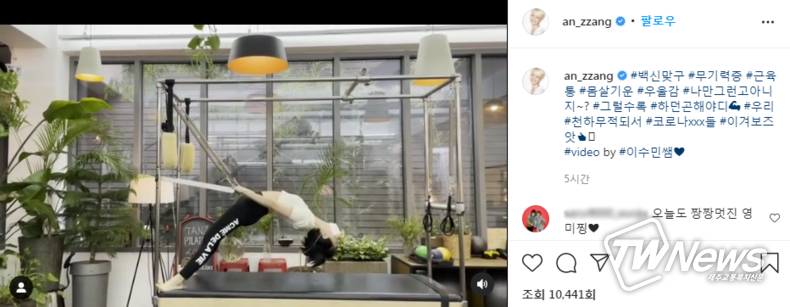 영상 속 안영미는 필라테스를 하며 백신 후유증 극복을 위해 노력하는 모습이다. 해당 게시물에는 ‘그럴수록 하던 건 해야지’, ‘우리 천하무적 돼서 코로나 이겨보자’ 등의 해시태그도 달려있다.