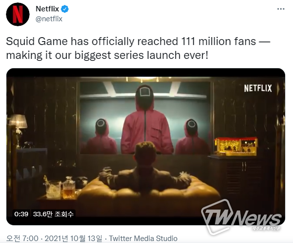 13일 넷플릭스의 공식 트위터 계정에는 “Squid Game has officially reached 111 million fans — making it our biggest series launch ever!”라는 글이 올라왔다. 자사가 보유한 시리즈 ‘오징어게임’의 시청자 수가 1억 1,100만에 달함을 자랑하는 내용이다.