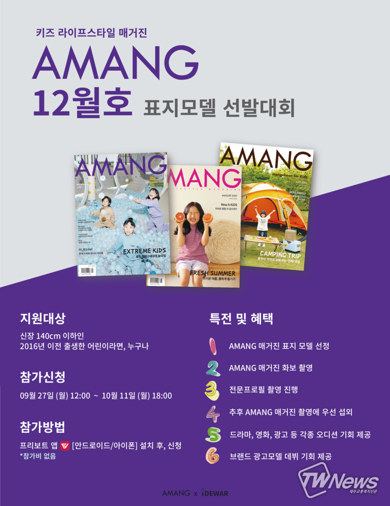 [제주교통복지신문 신혜정 기자] 국내 키즈 라이프스타일 전문 매거진 <AMANG(아망)>이 메인 표지모델 및 메인 화보를 언택트 시대에 맞춰 O2O 투표 플랫폼 ‘프리보트’를 통해 선발하고 있다.