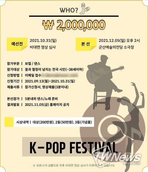 댄스, 보컬 경연대회 예선전은 각 팀들 비대면 영상심사가 이루어지며,본선은 12월 05일 군산예술의 전당 소극장에서 경연대회가 진행된다.