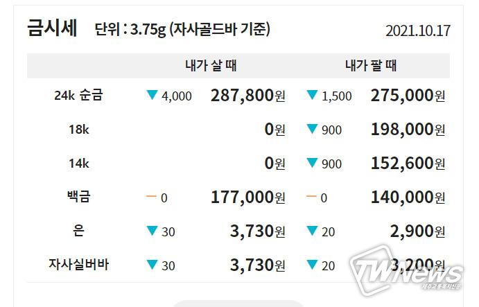 [제주교통복지신문 최효열 기자] 10월17일 일요일 0시 기준, 한국표준금거래소에 따르면 순금 1돈(Gold24k-3.75)은 28만 7,800원에 구입 가능하다.