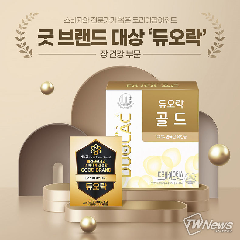 [제주교통복지신문 신혜정 기자] 마이크로바이옴 전문기업 쎌바이오텍의 프로바이오틱스 브랜드 ‘듀오락’이 ‘제2회 코리아 팜 어워드’에서 장 건강 부문 굿 브랜드 대상을 수상했다.