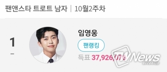 임영웅은 10월 11일부터 10월 18일 낮 12시까지 팬앤스타에서 진행된 10월 2주 차 트로트 남자 인기 랭킹 투표에서 1위를 차지했다. 획득한 표는 3,792만 6,076표에 달한다.