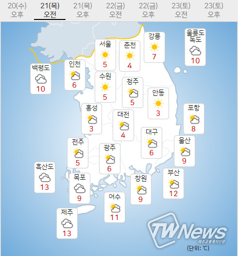 (21일) 아침최저기온은 서울 5도, 인천 6도, 수원 5도 등 0~7도, 낮최고기온은 서울 14도, 인천 14도, 수원 15도 등 13~16도가 되겠다.