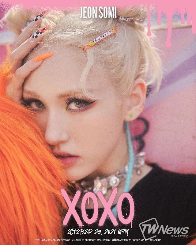이미지 속 전소미는 밝은 금발을 양 갈래로 묶어 올린 모습에, 강렬한 눈빛을 하고 있다. 또한 앨범명 ‘XOXO’와 ‘October 29. 2021 6PM’라는 발매 일자가 적혀있다.