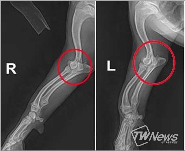 실제로, X-ray를 통해,척골 성장판 조기폐쇄증에 걸린 동물들을 살펴보면, 팔꿈치 관절 이탈구 소견이 있거나 ulna (척골) 성장판 조기 폐쇄를 확인할 수 있다. 앞다리 뼈에서 척골과 radius (요골)의 균형이 맞춰지지 않는 것을 확인할 수 있다.
