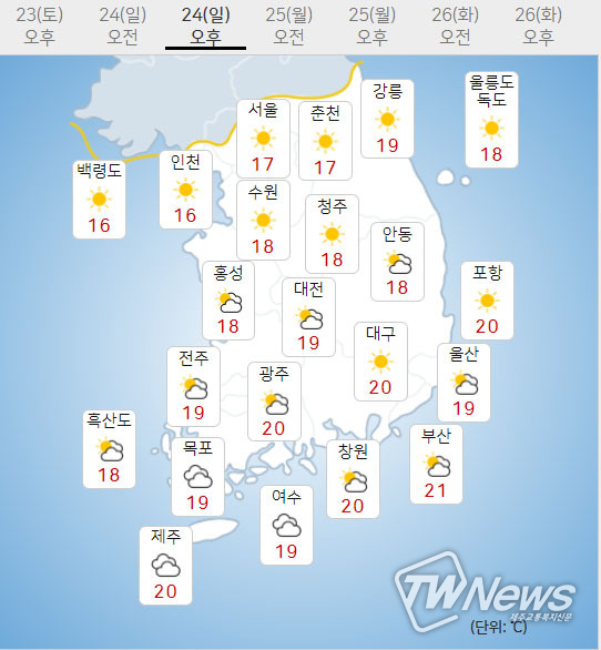 (주말전망) 23일(토)은 맑겠고, 24일(일)은 구름많겠다. 아침 기온은 12~15도, 낮 기온은 19~21도가 되겠다.
