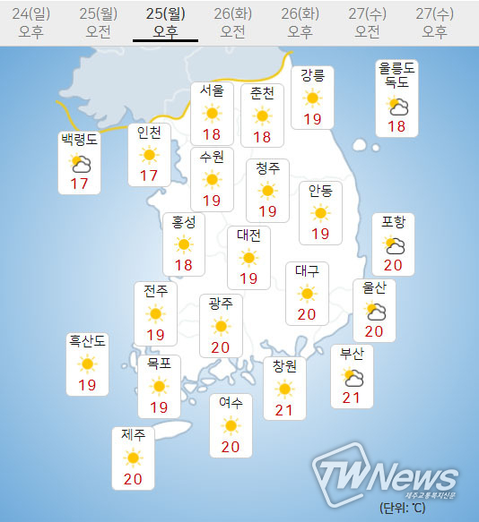 (25일) 아침최저기온은 서울 7도, 인천 9도, 수원 6도 등 2~9도, 낮최고기온은 서울 18도, 인천 17도, 수원 19도 등 16~19도가 되겠다.