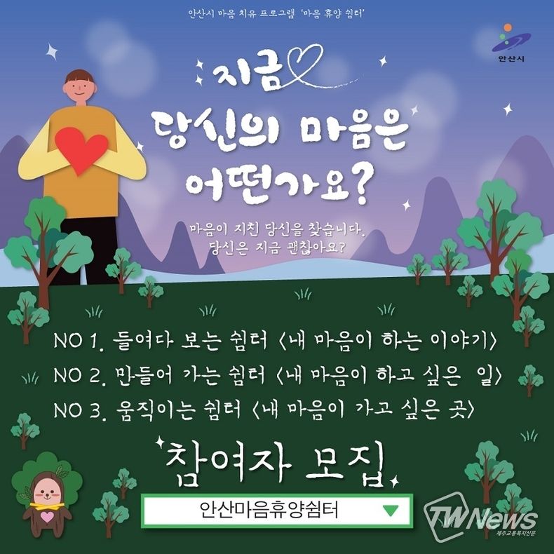 [제주교통복지신문 신혜정 기자] 안산시는 코로나 장기화로 직장, 주부, 청소년, 거주외국인들을 위한 쉼과 마음건강 치유를 목적으로 '안산마음휴양쉼터'를 개최한다.