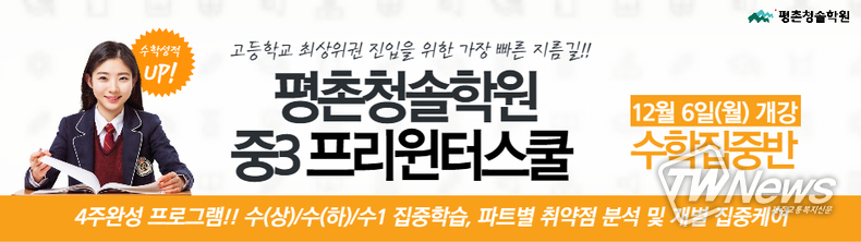 [제주교통복지신문 신혜정 기자] 평촌청솔학원에서 중학교 3학년 학생들을 대상으로 “2022년 프리윈터스쿨 수학 집중반” 프로그램을 개강한다고 밝혔다.