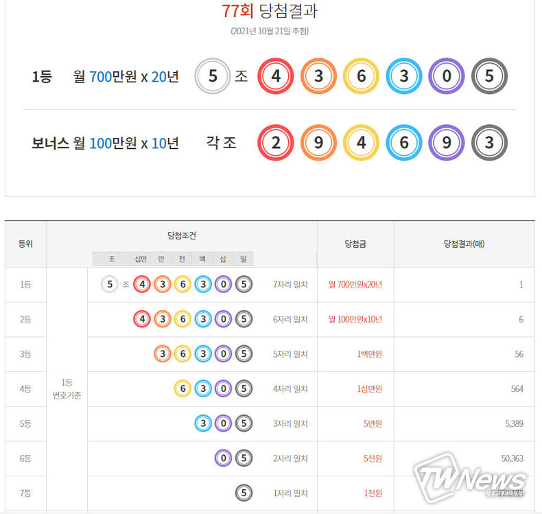 [제주교통복지신문 최효열 기자] 지난주 연금복권720+당첨확인 77회차 1등 당첨번호는 " 5조436305 "이다. 보너스번호는 " 294693 "이다.