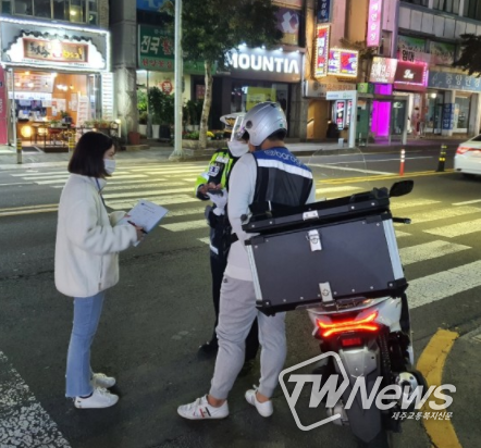 [제주교통복지신문 김현석 기자] 서귀포시와 서귀포경찰서는 코로나19로 배달 문화가 확산되면서 불법 운행 이륜차와 교통법규 위반행위로 인한 각종 사고가 증가함에 따라 지난 10월 28일 오후 7시부터 9시까지 천지동주민센터 교차로 주변에서 합동 단속을 실시했다.