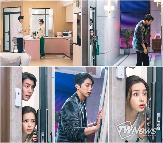 이런 가운데 이하늬, 이상윤이 불쑥 찾아온 송원석에 당황스러움을 드러내고 있는 ‘일촉즉발 발각 위기’ 현장이 포착돼 시선을 강탈하고 있다. 극중 조연주와 한승욱이 한승욱의 집 문을 두드리는 한성운(송원석)을 발견한 장면. 조연주 집에서 족뱅이 한 상을 차리고 있던 조연주와 한승욱은 밖에서 들리는 의문의 소리에 깜짝 놀라 문을 연다. 그러자 전혀 예상하지 못한 불청객 한성운이 건너편 한승욱의 집 문을 두드리고 있는 것. 얼굴을 쏙 빼고 조심스럽게 상황을 지켜보던 조연주와 한승욱에게서 불안한 기색과 초조함이 엿보이면서, 과연 두 사람은 이 위기를 무사히 넘기게 될지 궁금증을 증폭시키고 있다.