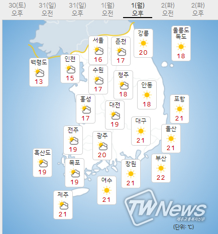 아침최저기온은 서울 11도, 인천 11도, 수원 10도 등 7~11도, 낮최고기온은 서울 16도, 인천 15도, 수원 16도 등 14~17도가 되겠다.