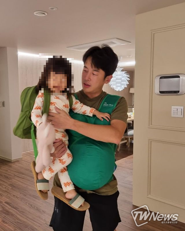 공개된 사진 속 그는 딸은 안은 채 임산부 체험을 하고 있는 모습이다.