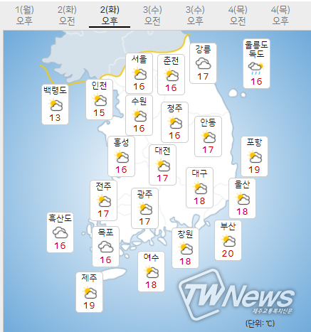내일(2일) 아침최저기온은 12~14도(평년 10~13도), 낮최고기온은 17~19도(평년 18~20도)가 되겠다.