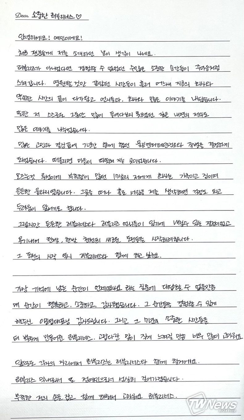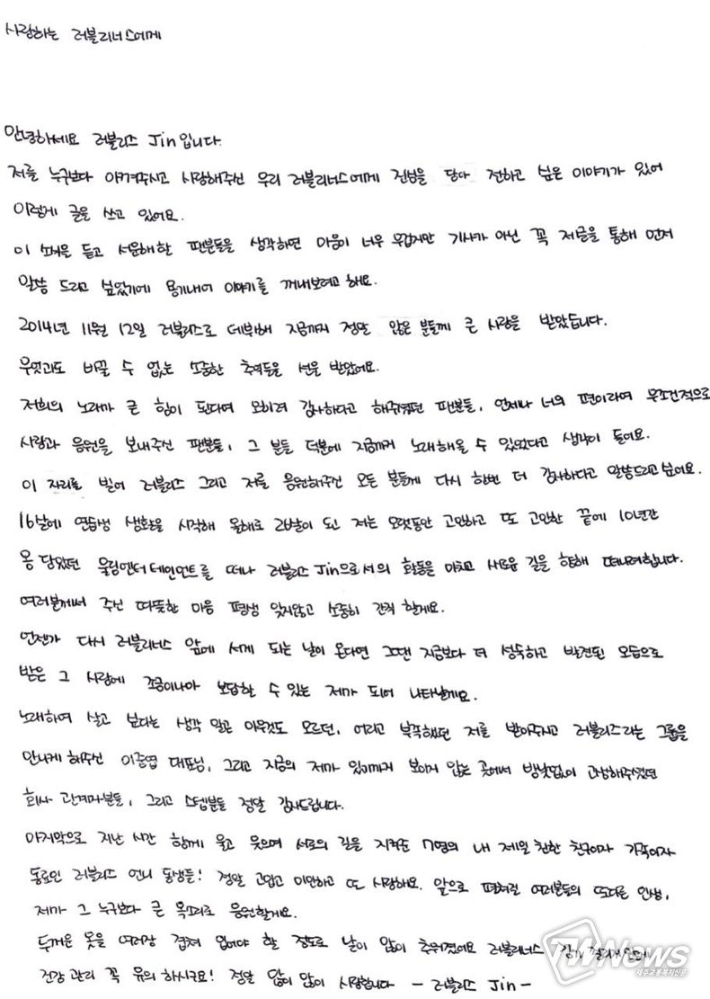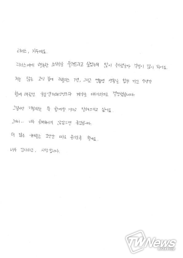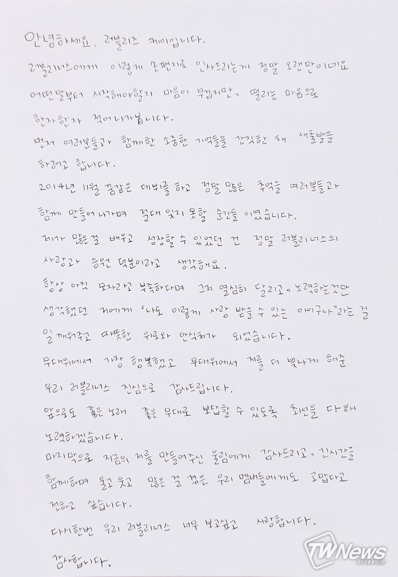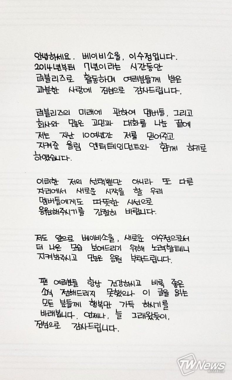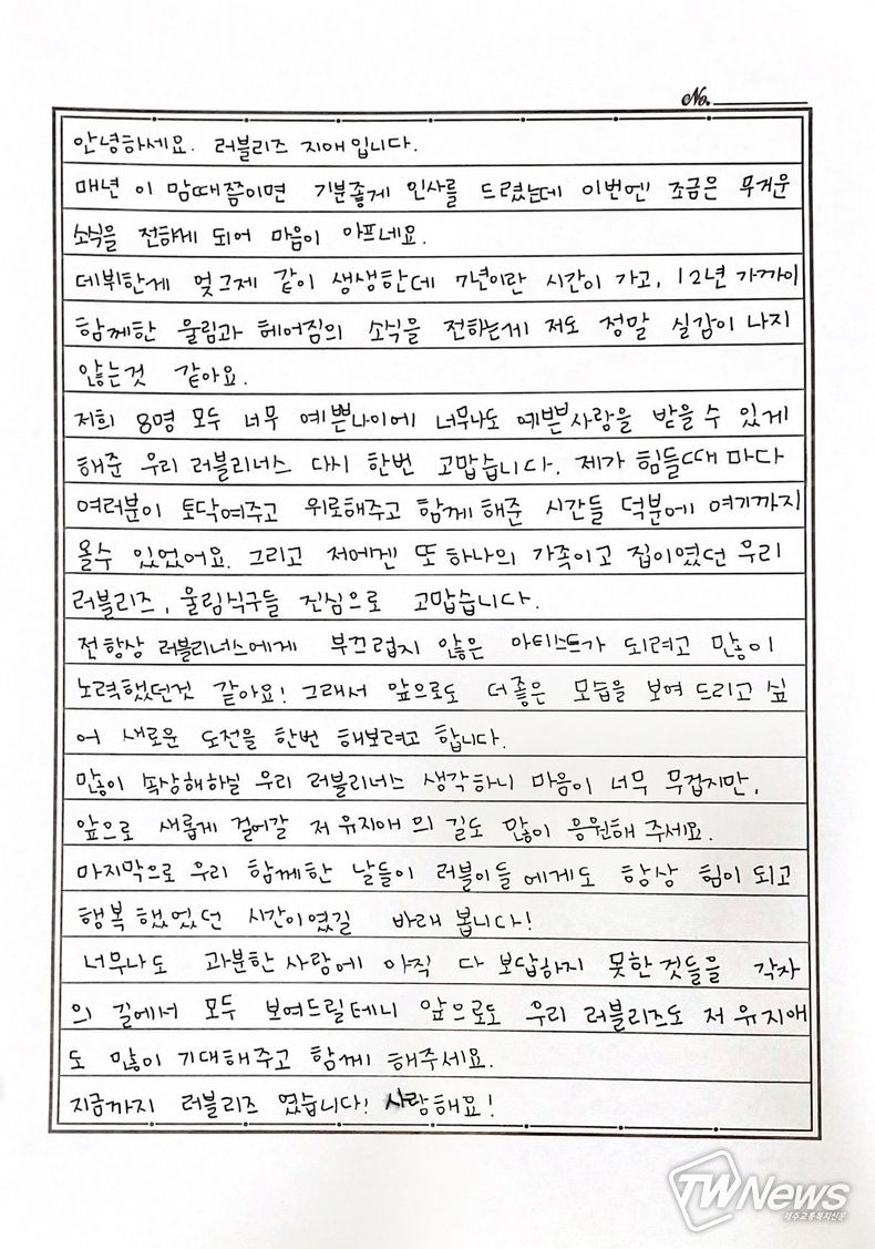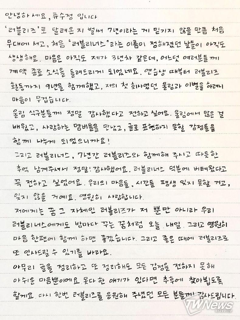 해체 소식과 관련, 러블리즈 멤버들은 공식 SNS를 통해 손편지를 공개하며 팬들에게 마지막 인사를 전했다.
