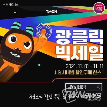 [제주교통복지신문 신혜정 기자] LG전자 공식 전문점 ‘이파트너스’가 LG시네빔의 5개 모델에 대해 ‘티몬 광클릭 행사’를 통해 할인 행사를 진행한다고 밝혔다.