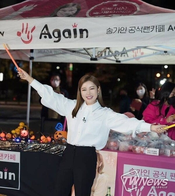 송가인은 지난 1일 자신의 인스타그램에 "어게인 최고!"라는 글과 함께 자신의 공식 팬카페(어게인)이 선물한 간식차, 커피차, 핼로윈 선물 앞에서 찍은 사진을 게재했다.