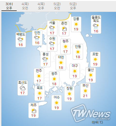 오늘(3일) 낮 기온은 어제(2일, 14.3~20.6도)와 비슷하거나 조금 높아 전국 대부분이 16~21도가 되겠다. 한편, 낮과 밤의 기온차 10~15도로 크겠고, 특히 남부내륙은 15도 이상으로 매우 크겠다.