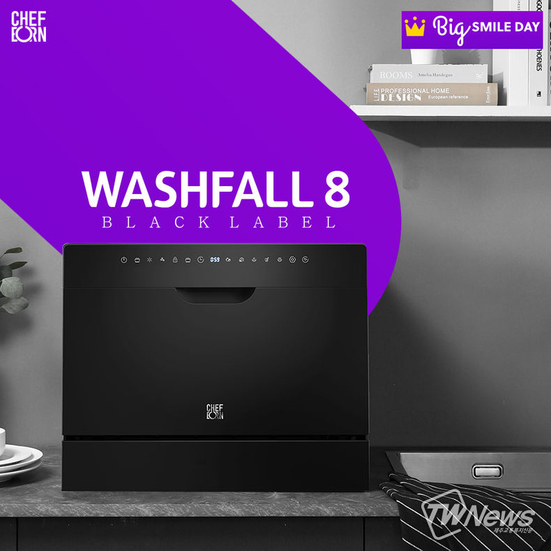 이번 빅스마일데이 할인전에 포함되는 쉐프본 ‘워시폴8 블랙라벨’은 올블랙 미러 디자인의 6~8인용 식기세척기이다. 자동문열림 기능을 탑재해 건조를 위해 세척이 끝날 때까지 기다리지 않아도 된다. 무설치형식과 설치형식이 모두 가능한 듀얼 설치 방식으로 타공 작업이 어려운 전∙월세 집에서도 사용이 가능하다.