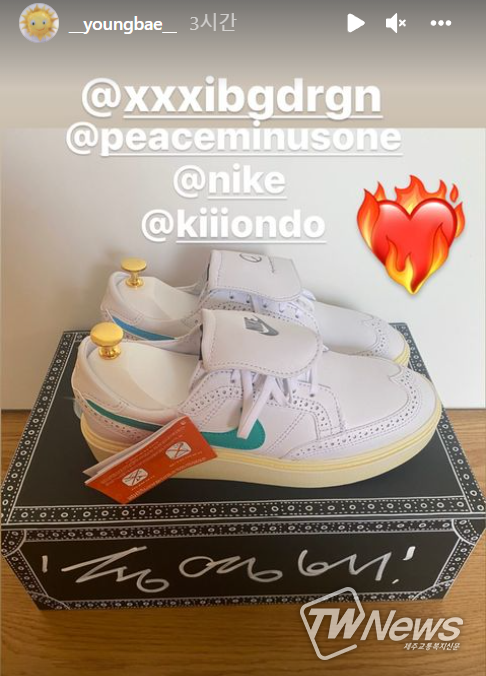 해당 운동화는 최근 지드래곤과 한 브랜드의 협업을 통해 제작된 한정판으로, 상자에는 태양의 본명인 ‘동영배’라는 글자가 적혀있다.