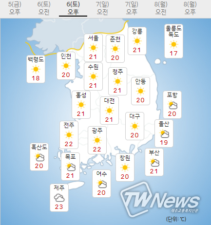 (6일) 아침최저기온은 16~17도(평년 11~14도), 낮최고기온은 21~23도(평년 19~21도)가 되겠다.