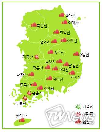 주왕산 지리산 소백산 가야산 가지산 청량산 문경새재 금오산 팔공산 연화산 비슬산 신불산 운문산 화왕산 기백산 황매산 웅석봉 방어산 봉명산 호구산 성인봉 백암산 토함산 천태산 대성산 무학산 장산 금정산