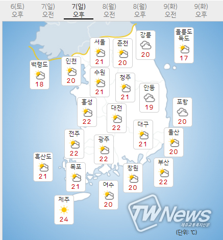 (7일) 아침최저기온은 서울 9도, 인천 11도, 수원 9도 등 4~11도, 낮최고기온은 서울 21도, 인천 20도, 수원 21도 등 19~22도가 되겠다.