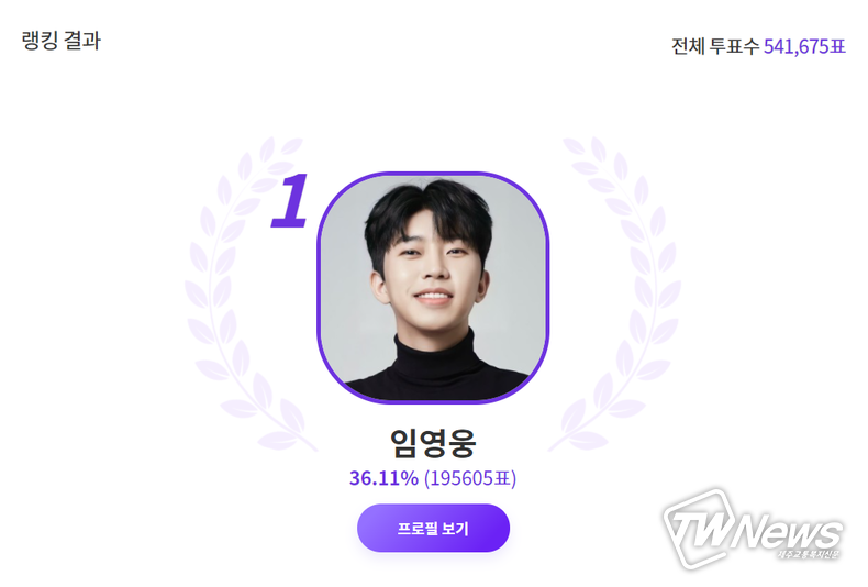 해당 조사는 10월 31일부터 11월 6일까지 익사이팅디시에서 진행했고, 임영웅은 총 투표수 54만 1,675표 중 19만 5,605표(득표율 36.11%)를 획득했다.