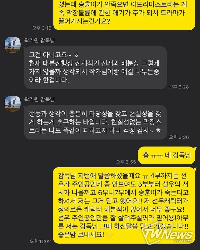 이어서 이지훈은 박계형 작가를 만나본 적이 없다고 호소했다. “두 번째는 작가님과 제작사대표님과의 녹취록, 저는 한 번도 뵌 적 없고 소통한 적이 없는 박계형 작가님이다. 사실 제작사 대표님, 작가님, 감독님 사이의 일은 저는 어떤 대화를 하셨는지 모르니 드릴 말씀이 없다. 다만 곽기원 감독님과 카톡 내용을 그냥 올려드린다”라며 사진을 공개했다.