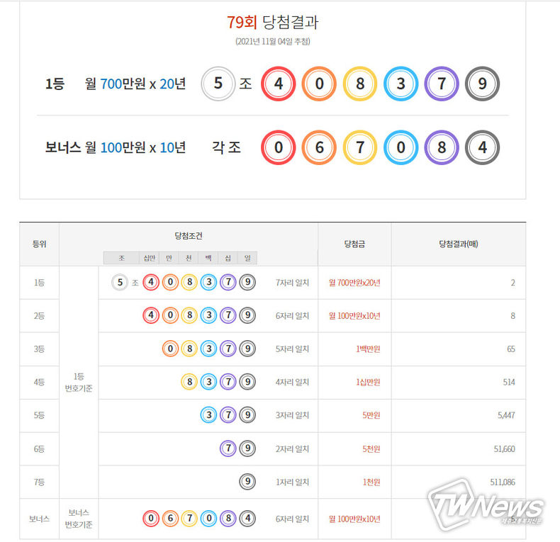 [제주교통복지신문 최효열 기자] 지난주 연금복권720+당첨확인 79회차 1등 당첨번호는 " 5조408379 "이다. 보너스번호는 " 067084 "이다.