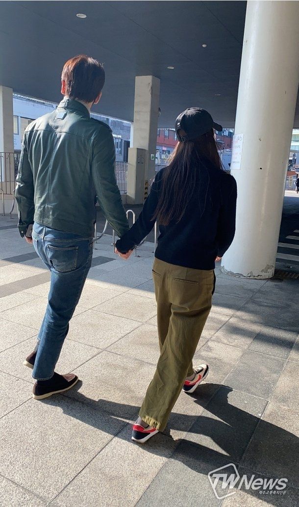 사진 속에는 비와 김태희가 손을 꼭 잡고 걷고 있다. 김태희는 야구 모자에 운동화를 신고 면바지를 편안하게 입은 모습이 눈길을 끈다.