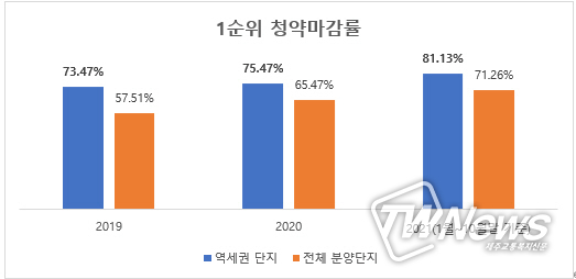 지난 2020년 단지명에 ‘역’이 들어간 역세권 아파트는 53개 단지가 분양해 40개 단지가 1순위 마감을 기록하면서 1순위 청약 마감률 73.58%를 기록했고, 이는 전체 평균인 65.47%보다 높았다. 또 2019년에도 49개 단지 중 36개 단지가 1순위 청약 마감을 기록하며 73.47%의 1순위 청약 마감률을 기록했다. 당시 전체의 1순위 청약 마감률은 57.51%에 불과했다.