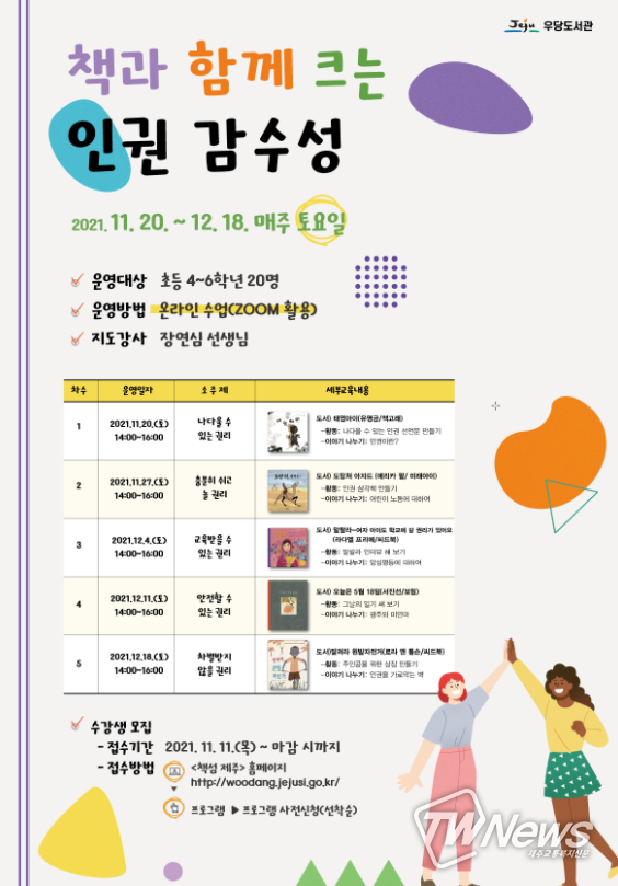 [제주교통복지신문 김현석 기자] 제주시 우당도서관에서는 어린이들이 인권에 대한 개념을 배우고 각종 피해 사례를 통해 인권이 무엇인지 생각해볼 수 있는 기회를 제공하기 위해 ‘책과 함께 크는 인권 감수성’ 프로그램을 운영한다고 밝혔다.