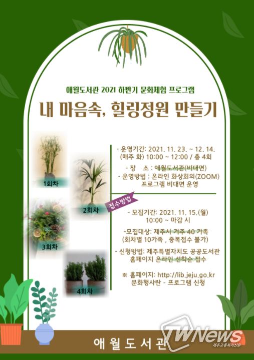 [제주교통복지신문 김현석 기자] 제주시 애월도서관에서는 코로나19와 바쁜 일상생활에 지친 시민들을 위한 원예 치유 프로그램 <내 마음속, 힐링정원 만들기>를 운영한다고 밝혔다.
