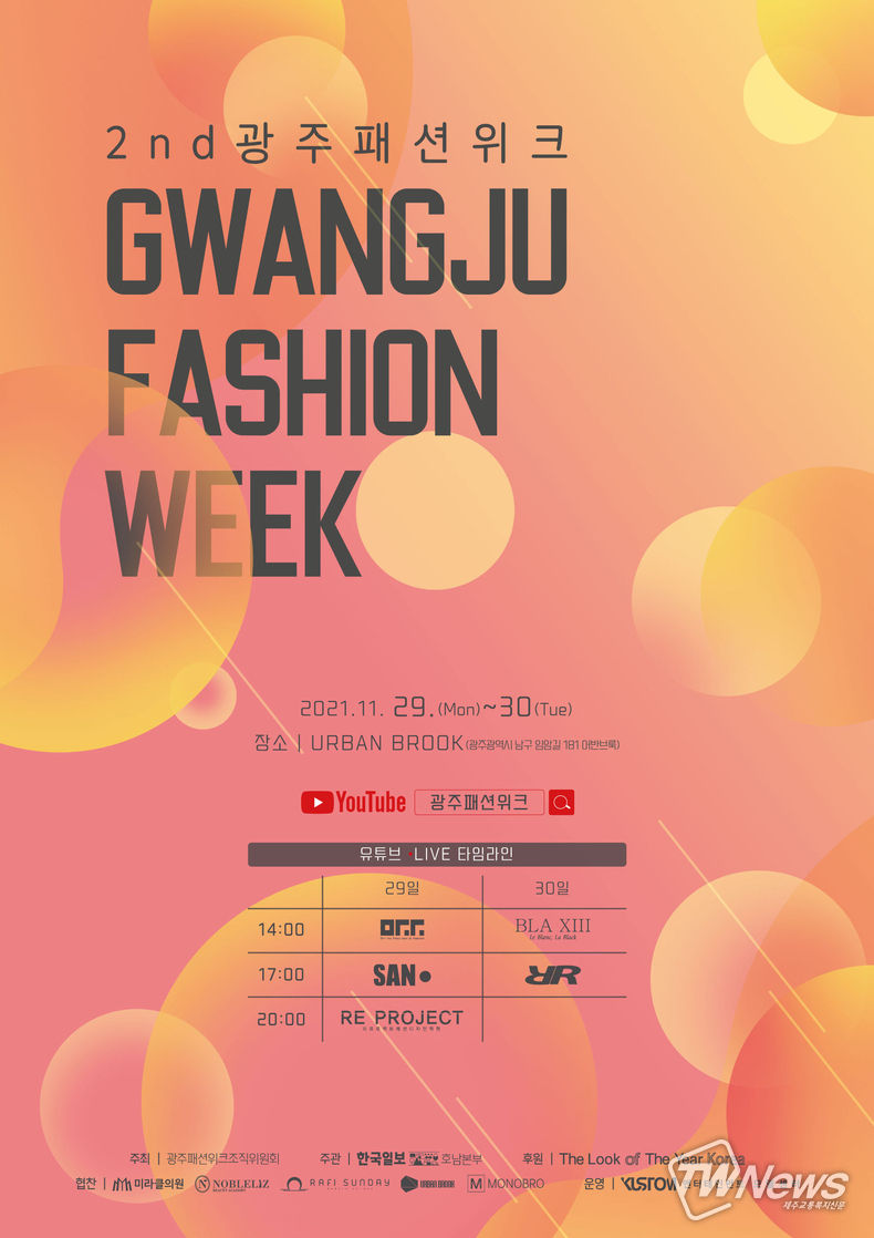 지역 경제 활성화와 뷰티·패션 산업의 새로운 활력을 불어넣기 위해 기획된 ‘2021 광주패션위크’는 올해 2회째를 맞이했으며, 광주패션위크 조직위원회가 주최하고 한국일보 호남본부가 주관하는 행사다. 올해 행사는 11월 29일부터 30일까지 총 5개 브랜드로 개최될 예정이다.