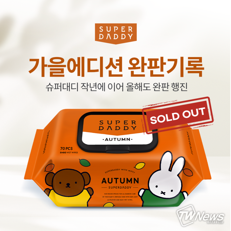 [제주교통복지신문 민진수 기자] 아기물티슈 전문 브랜드 슈퍼대디가 올가을 한정판으로 출시한 가을에디션이 작년에 이어 올해도 완판을 기록했다고 전했다. 세계적인 캐릭터 미피와 콜라보한 패키지 디자인을 통해 아이들은 물론 육아에 지친 어른들에게도 힐링을 선사한 것으로 보인다.