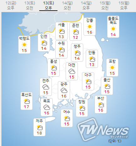 (13일) 아침최저기온은 서울 1도, 인천 3도, 수원 0도 등 -5~3도, 낮최고기온은 서울 13도, 인천 14도, 수원 14도 등 12~14도가 되겠다.