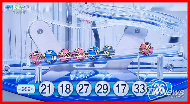 [제주교통복지신문 최효열 기자] 989회 로또 1등당첨번호조회는 " 21, 18, 27, 29, 17, 33 "이다. 2등 보너스번호는 " 26 "이다.