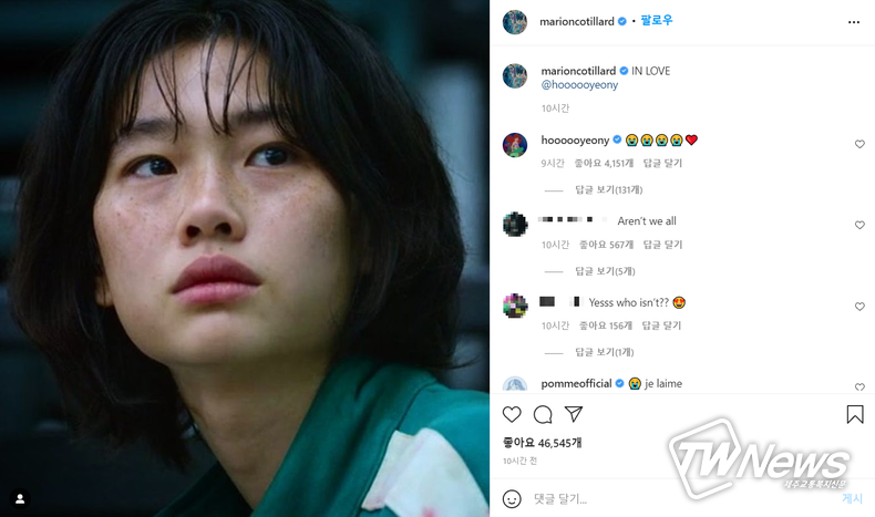 15일(현지 시간) 마리옹 코티야르는 자신의 인스타그램에 정호연의 사진을 게재하며 정호연의 인스타그램 아이디를 태그했다. 그러면서 “IN LOVE”(사랑에 빠졌다)라고 덧붙여, 팬심을 드러냈다.