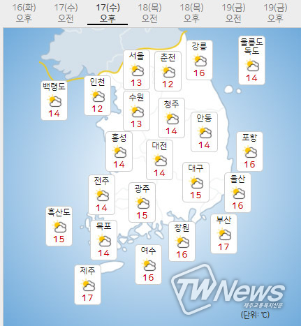 (18일)까지 기온은 (16일, 아침최저기온 9~12도, 낮최고기온 16~19도)과 비슷하겠다.